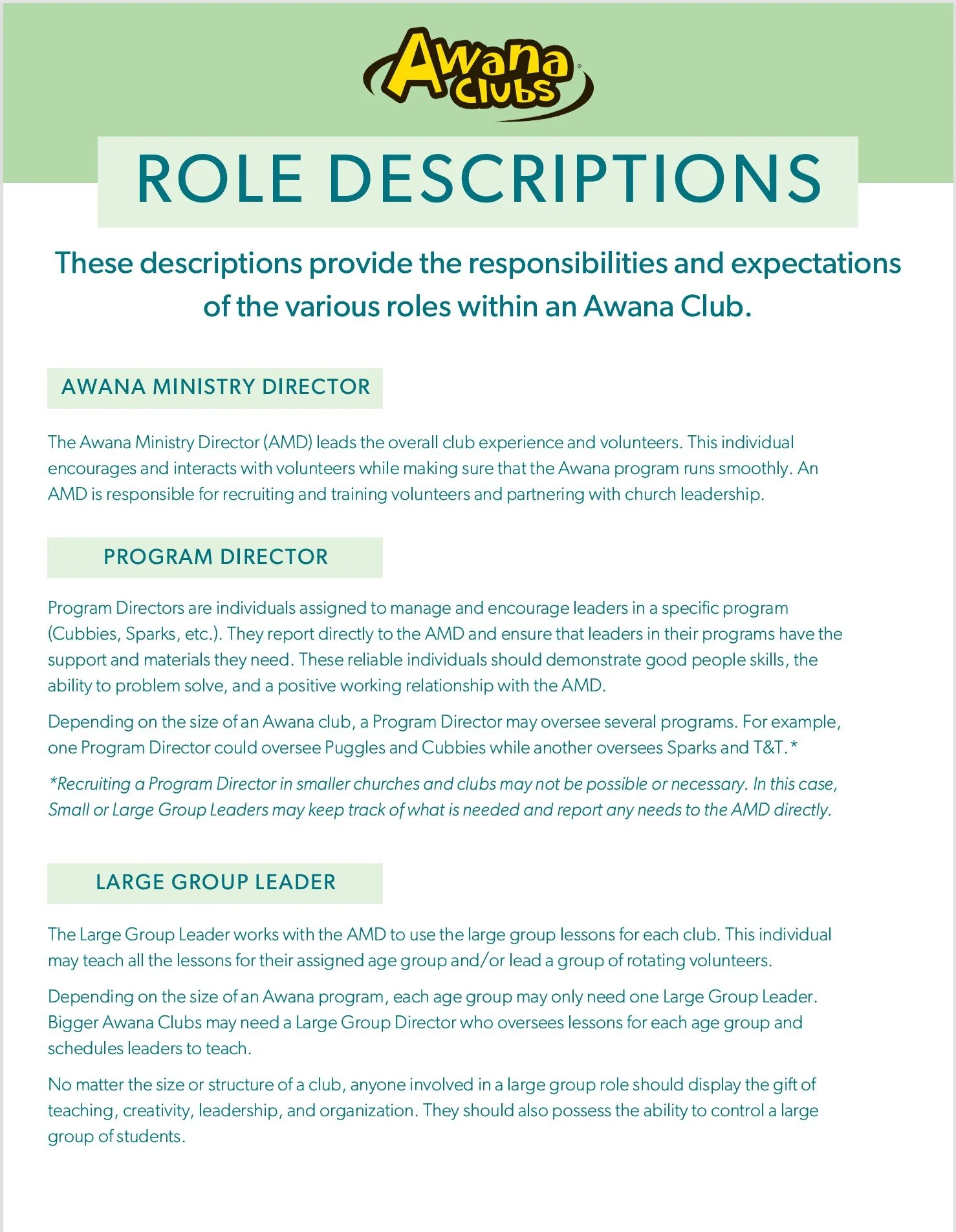Leader Role Descriptions - Secretary Role, Student Leader, Verse Listener, Worship Leader, Awana Ministry Director, Club Director